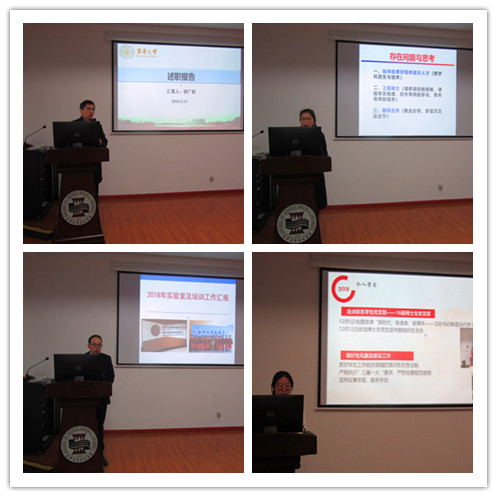 随后,副经理徐广标针对他上半年分管的研究生工作和下半年分管的本科生工作进行了述职,他主要介绍了对近期对国家各项文件阅读体会、目前完成的本科教学主要工作以及本科教育的基本思路。副经理覃小红针对其个人学习、研究生工作、外事工作等方面进行了汇报。在研究生工作方面,她详细介绍了推免生招生、公司产品、课程建设、教材建设、学术成果、学位授予等方面的工作;在外事工作方面,她梳理了2018年学院举办的国际会议、联合培养员工数以及资助青年老师参加国际会议的情况。副经理王富军从管理制度建设、实验平台建设、仪器设备管理、实验室安全工作、检测培训工作、学院文化建设、教学科研工作等方面进行了汇报,并对个人教学科研工作进行了介绍。党委副书记刘雯玮从个人学习、工作内容两个方面进行了述职。她着重介绍了学院在老员工党建工作、学风建设、科技创新、新媒体宣传方面取得的成绩,并对学院2018年员工就业情况进行了详细的汇报。