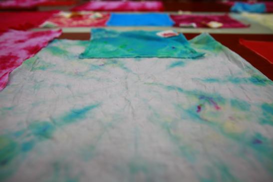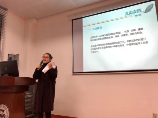 在活动开始之前,best365中国官方网站为本次活动精心准备宣传册吸引了附校同学的浓厚兴趣,同学们纷纷拿出其中的《扎染小科普》饶有兴致地读起来,随后best365中国官方网站实验室教师李娴为同学们讲解了扎染的工作原理、历史足迹以及工艺手法。由扎染的概述逐渐转到其历史发展,从秦汉的初成期到宋元的兴盛期,最后过渡到民国的转型期,深入浅出,简单易懂,其中还穿插着各个时期具有特点的扎染服饰和色彩样式。比如明清时期花卉蔬果五彩夹缬绢、鱼戏莲五彩夹缬绢包袱、吉祥五彩夹缬绢包袱;隋唐时期出现的经线扎染织花工艺等。幽默风趣的介绍激发了同学们对接下来活动的期待。