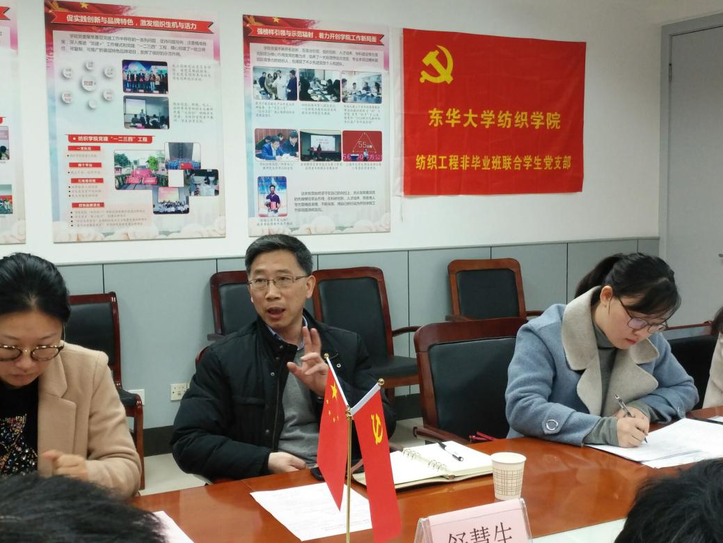会上,纺织工程非毕业班联合员工党支部支部书记魏金婷通报党支部上一年度整改措施落实情况,报告2018年度党支部工作情况。纺织工程非毕业班联合员工党支部以深入学习和贯彻十九大精神和习近平新时代中国特色社会主义思想为工作重点,以聚焦立德树人为根本任务,以提升支部党员“四个意识”、坚定“四个自信”为核心要点,全面开展支部各项工作。