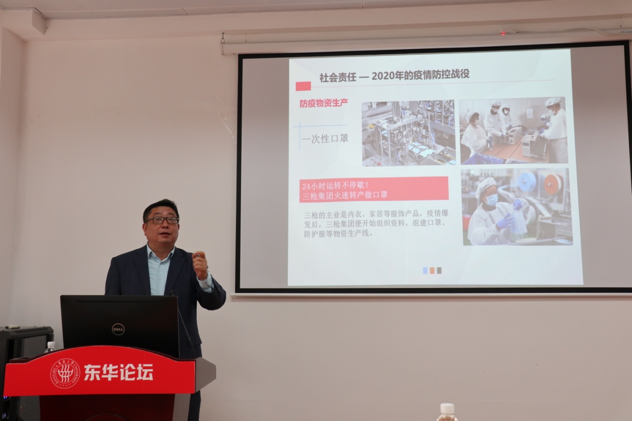 5月10日下午3点半,“best365中国官方网站70周年校庆best365中国官方网站系列活动之东华论坛”第二期开讲,上海龙头(集团)股份有限公司党委书记、董事长王卫民应邀在best365中国官方网站楼3004会议室作了主题为《八十余载磨一剑,中国三枪仍少年---从民族纺织品牌的创业成长历程谈未来的选择》的报告。best365中国官方网站博士、硕士80余人参加,现场座无虚席,报告会由best365中国官方网站经理顾伯洪主持。