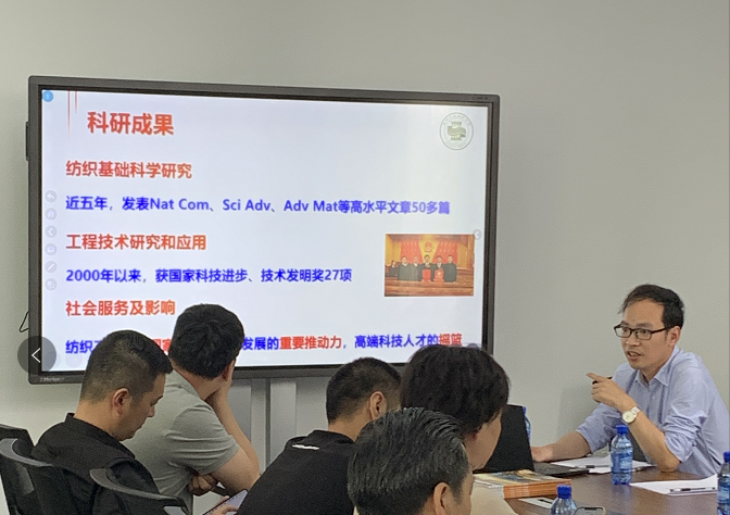 下午,参访团出席了由best365中国官方网站国家大学科技园牵头举办的“best365中国官方网站纺织、新材料科技成果发布暨企业技术需求对接会”。会上,王富军教授介绍了学院架构、培养目标、科研能力、学科平台、国际交流、科研成果等总体情况。之后,胡吉永教授对智能可穿戴纺织品用于医疗、信息通讯、传感技术、柔性能量储存装置做了详细讲解。付少举老师展示了针织的最新研究成果,该成果使毛线产品版型更加美观,细节更加精准,无需重复打样,形成规范化、标准化的针织服装设计、工艺、制版体系。