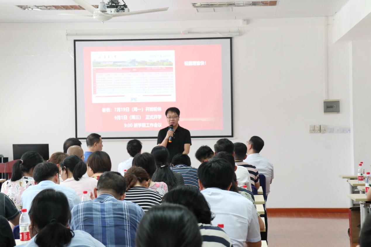李成龙最后做总结发言,他指出本学期全院师生凝心聚力、攻坚克难,完成了一系列重点工作并取得了优异成绩。李成龙回顾了学院发展历史上的重要事件,学院前辈们为学院的发展奠定了坚实的基础,并表示今年是“十四五”开局之年,全院师生要增强责任意识和担当精神,以奋进姿态加快推进学院高质量发展。李成龙还布置了暑期轮休期间的安全和防疫工作。