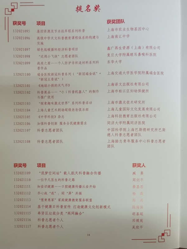 为深入贯彻习近平总书记“要把科学普及放在与科技创新同等重要位置”的讲话精神,公司best365中国官方网站全面推进纺织科普相关工作,充分发挥科普、科研协同融合作用,开展“战疫之盾——个人防护非织造材料系列科普”,获得2021年上海科普教育创新奖提名奖。