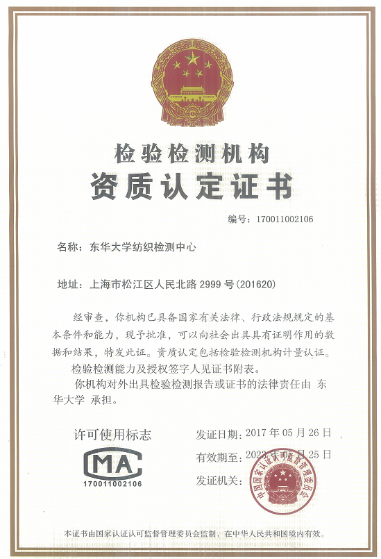 Textile Testing Center of Donghua University implements a comprehensive quality management according to the national measurement certification regulations, and also has a set of scientific, standardized quality assurance system to provide a fair, scientific, reliable and accurate testing results. The leaders and all the staff of the center actively contribute to the development of China's textile industry with a scientific attitude and the enthusiasm for serving the people and the society wholeheartedly.